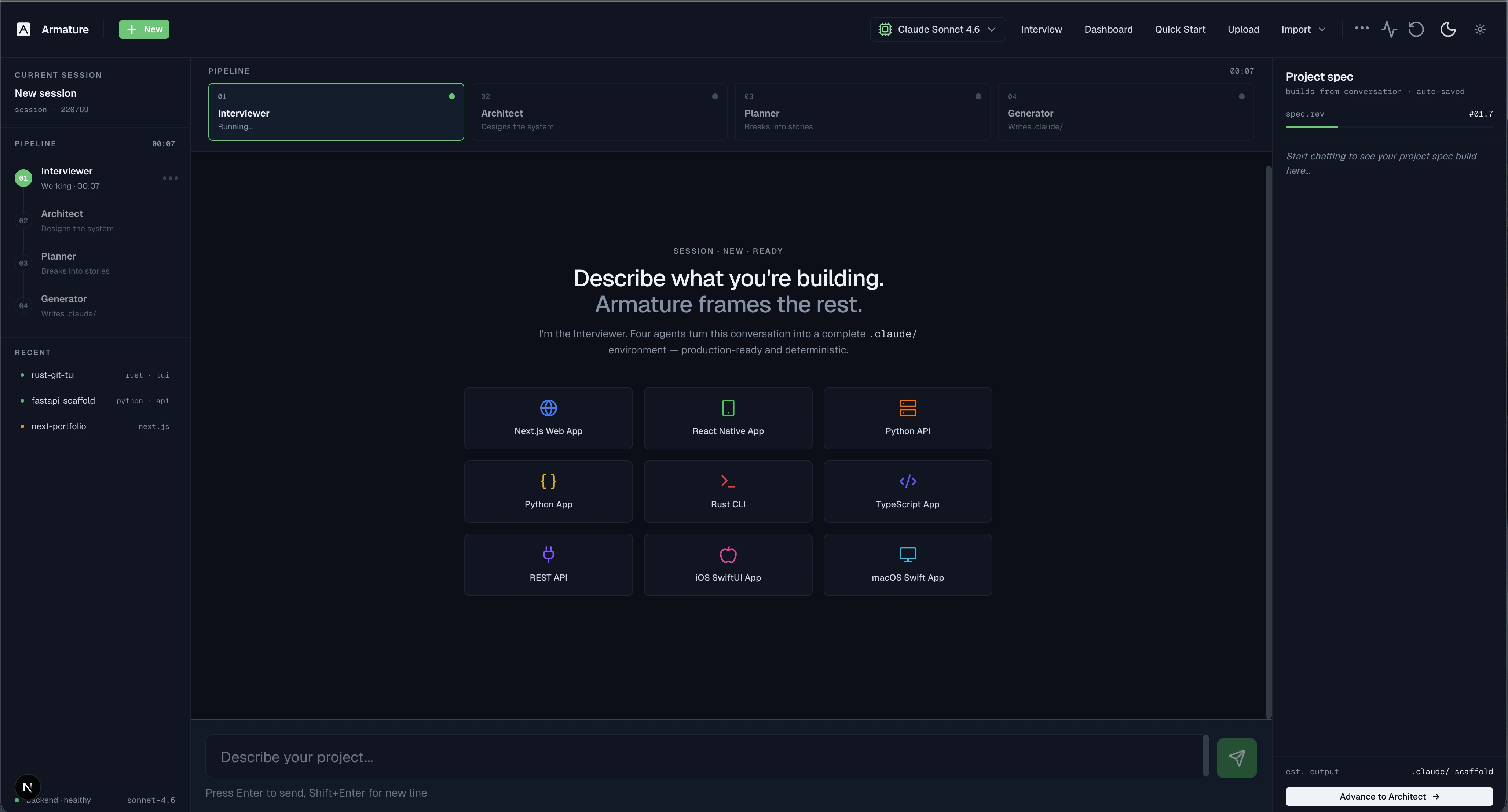 Powered by Armature, a founder-built system that moves projects through four stages, interview, architecture, planning, and generation. The result is a clearer path from idea to execution, with more structure, less setup tax, and a stronger foundation for delivery.